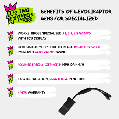 Remove the speed restriction for Levo, Levo SL, Creo2, Creo SL, Vado SL, Kenevo, Kenevo SL and Turbo Como SL 4.0, release the full potential of the Specialized Ebike. Compatible with all Gen 2 and Gen 3 Specialized e-bikes including SL models fitted with top tube TCU and Mastermind TCU display (except SL 1.2 motor)
