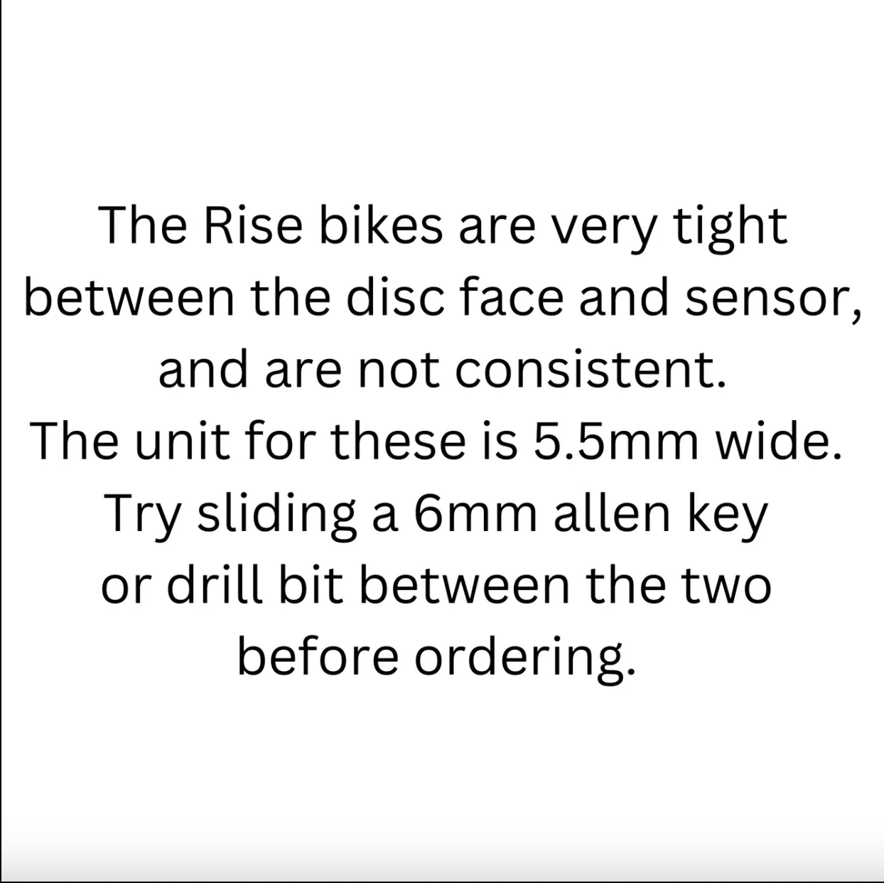 - The Rise bikes are very tight between the disc face and sensor, and are not consistent. The unit for these is 5.5mm wide. Try sliding a 6mm allen key or drill bit between the two before ordering.